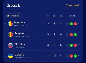 Minutul 24 – GOL SLOVACIA – Kucka centrează de pe dreapta și Duda reia cu capul în poarta României, din marginea careului mic, la colțul lung. Slovacia vs România 1-0. În cealaltă partidă, Ucraina vs Belgia este 0-0.