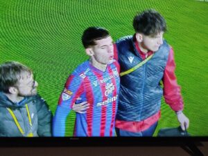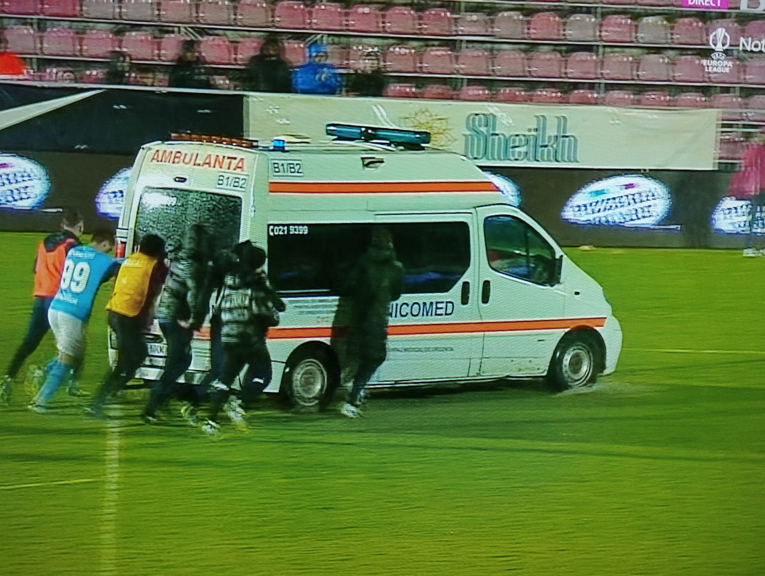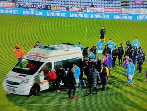 Minutul 90+9 – Ambulanța părăsește terenul împinsă din spate de jucătorii ambelor echipe! Meciul a fost întrerupt timp de nouă minute, timp în care medicii au încercat să stabilizeze piciorul fotbalistului grav accidentat.