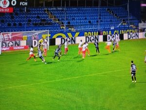 Minutul 21 – Jair șutează din afara careului, la colțul lung, însă Gavrilaș respinge îm afara terenului. Sibienii execută al 3-lea corner, după cele două obținute în minutul 21.