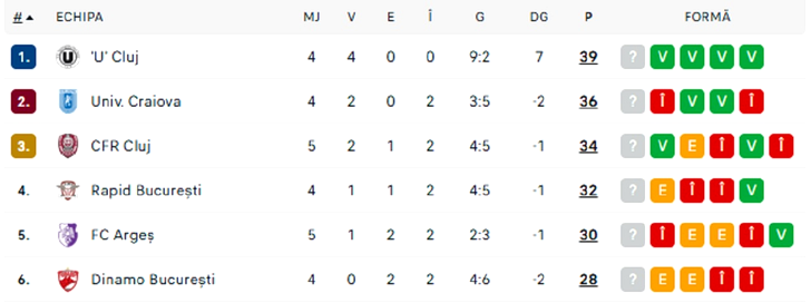 Clasament Play-off, runda 5, după FC Argeș vs. CFR Cluj 0-1/ captură flashscore.ro