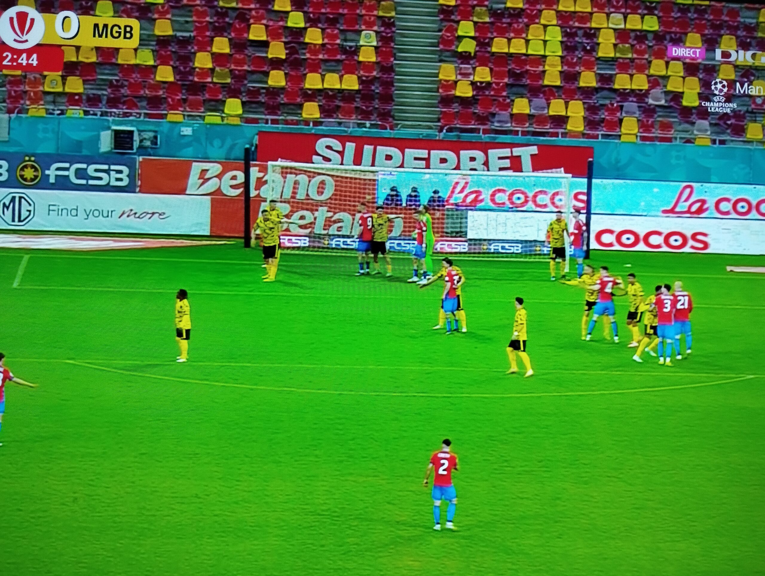 Minutul 41 – FCSB se grăbește să înscrie până la pauză, însă lovitura de cap a italianului Juri Cisotti este blocată, iar șutul trimis de Tănase se duce peste poartă.