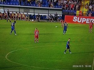Minutul 20 – Jucătorii celor două formații apelează la multe mingi lungi. Suprafața de joc este denivelată și pe alocuri „cheală”